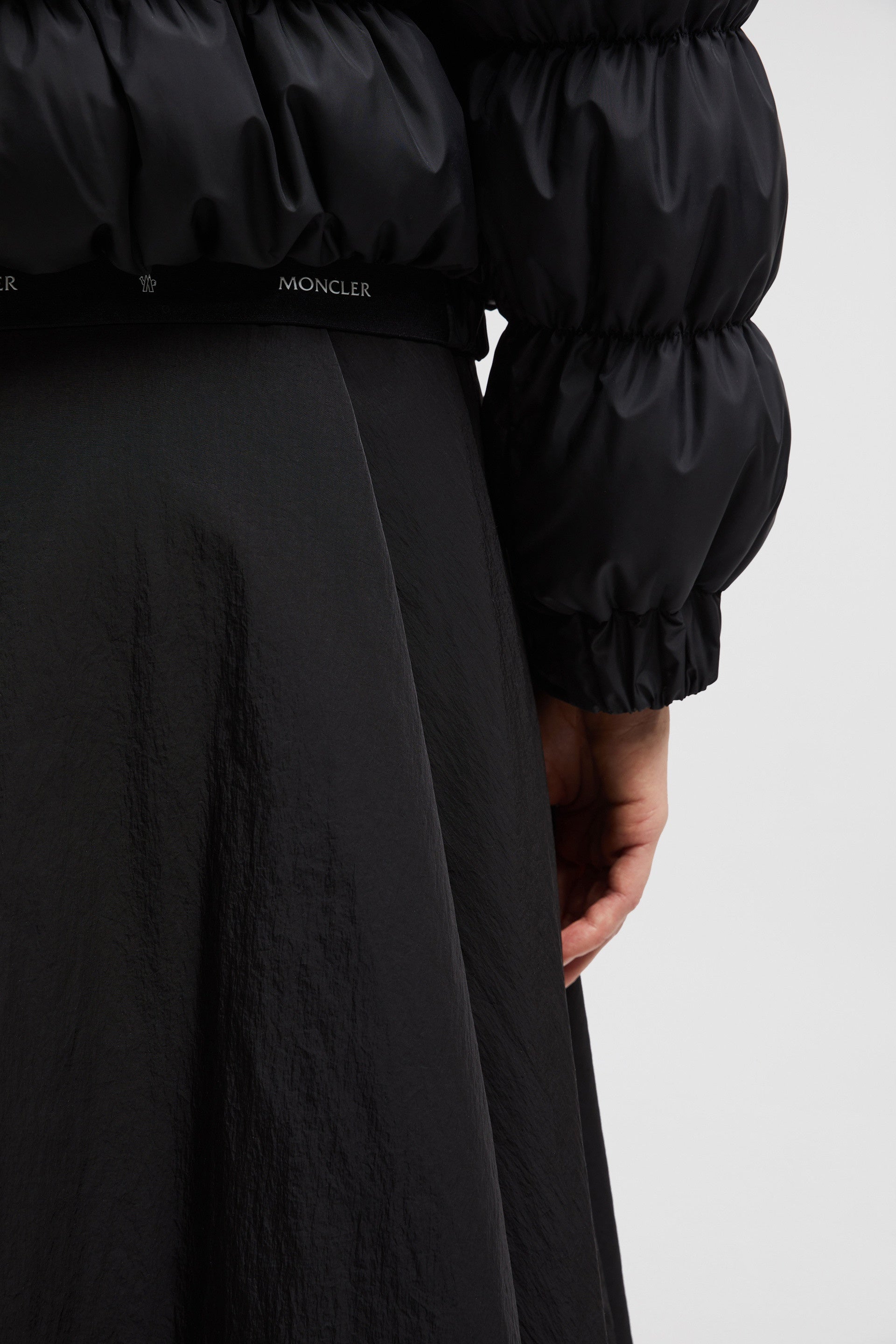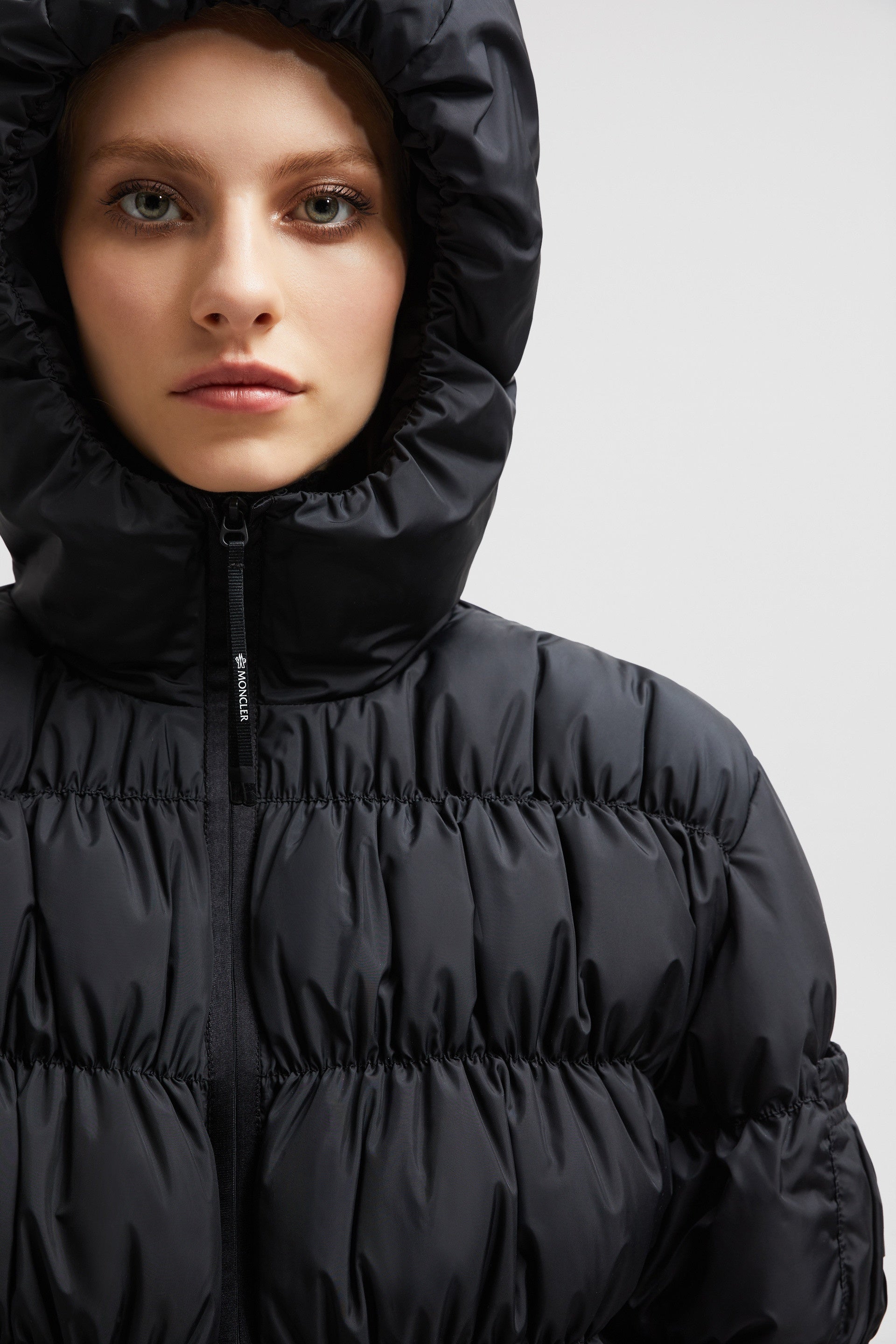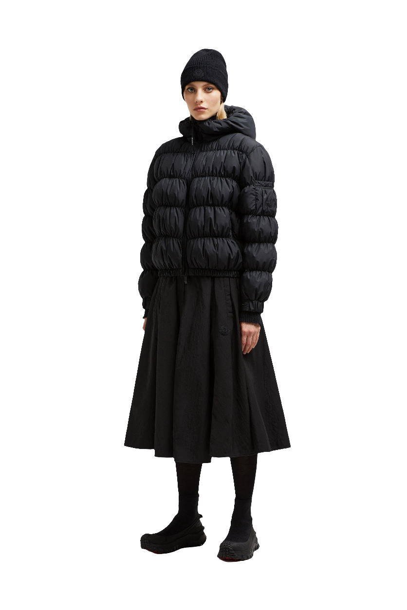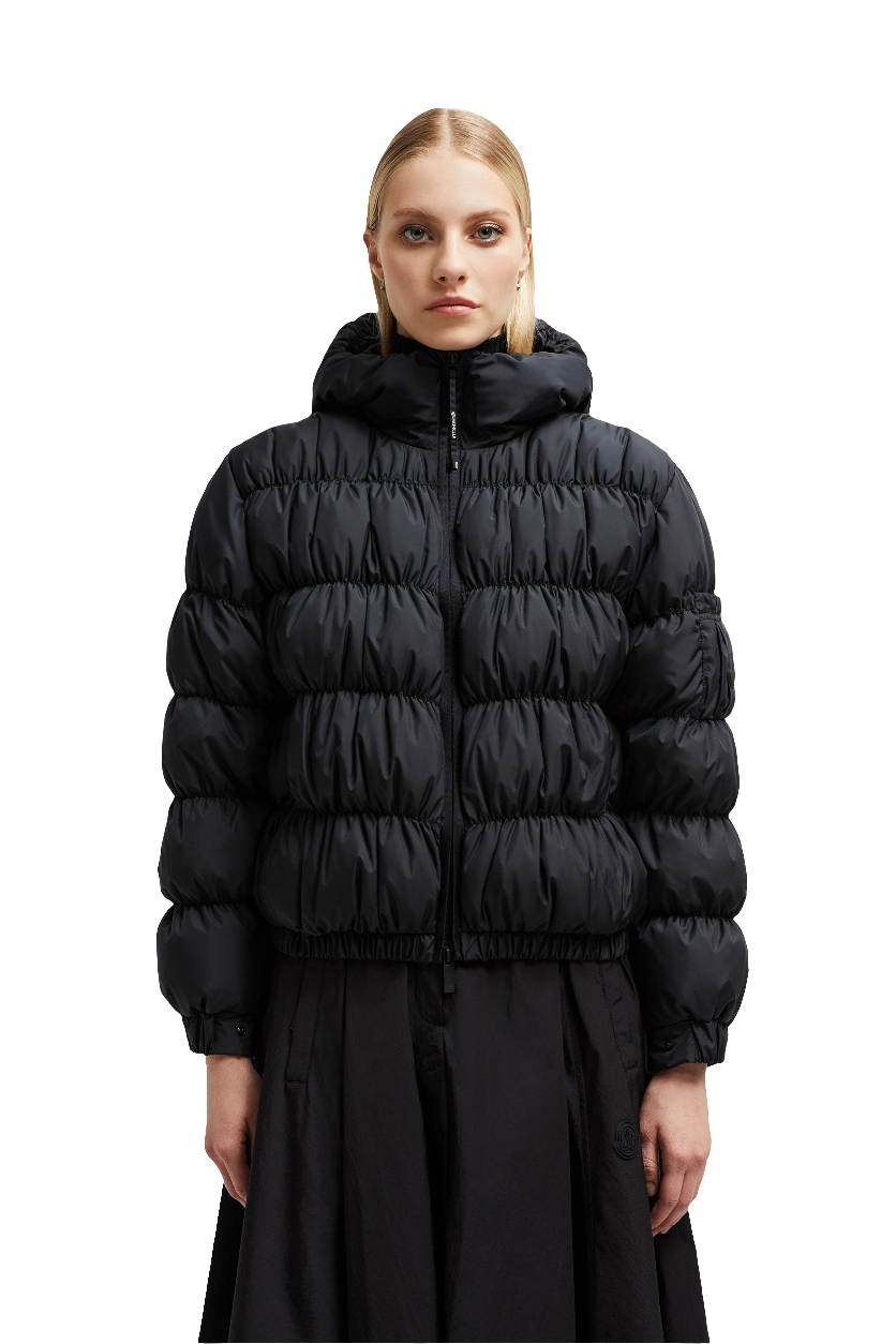 Defined by ruches, the Medonte short down jacket for women is a new interpretation of feminine designs. A new take on an elegant detail, the Medonte puffer is defined by ruched boudin quilting. The short down jacket fuses a modern aesthetic with technical performance, crafted from an extremely soft and down proof fabric. A hood, high neck and elastic trim complete the style with added protection from the elements.