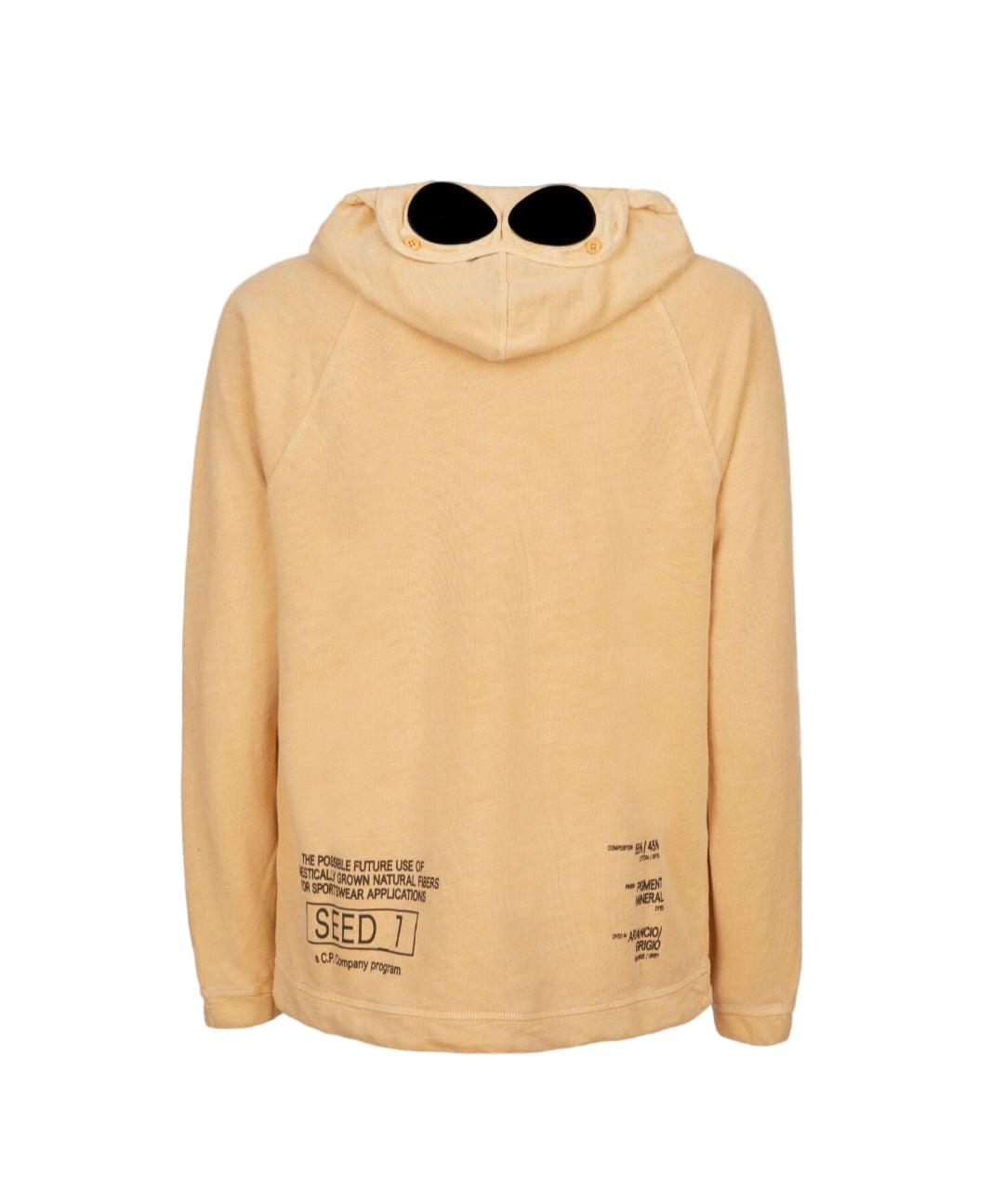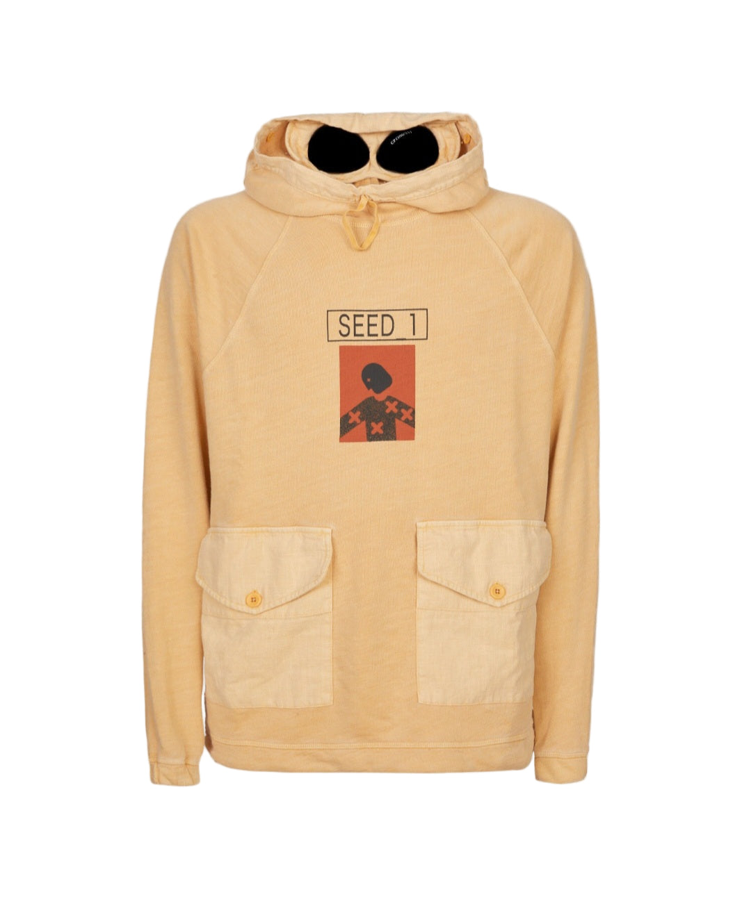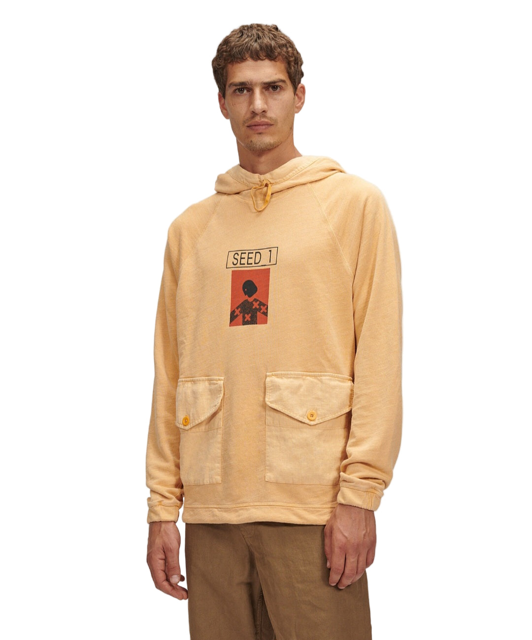 Seed 2 capsule (dyed with natural pigments). A comfortable hoodie made of natural cotton. A straight fit with long raglan sleeves. A cozy hood with a folding peak equipped with Google lenses, fabric patch pockets on the sides with buttoned flaps, and a Seed 2 print on the chest.