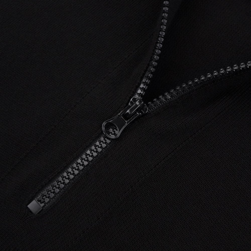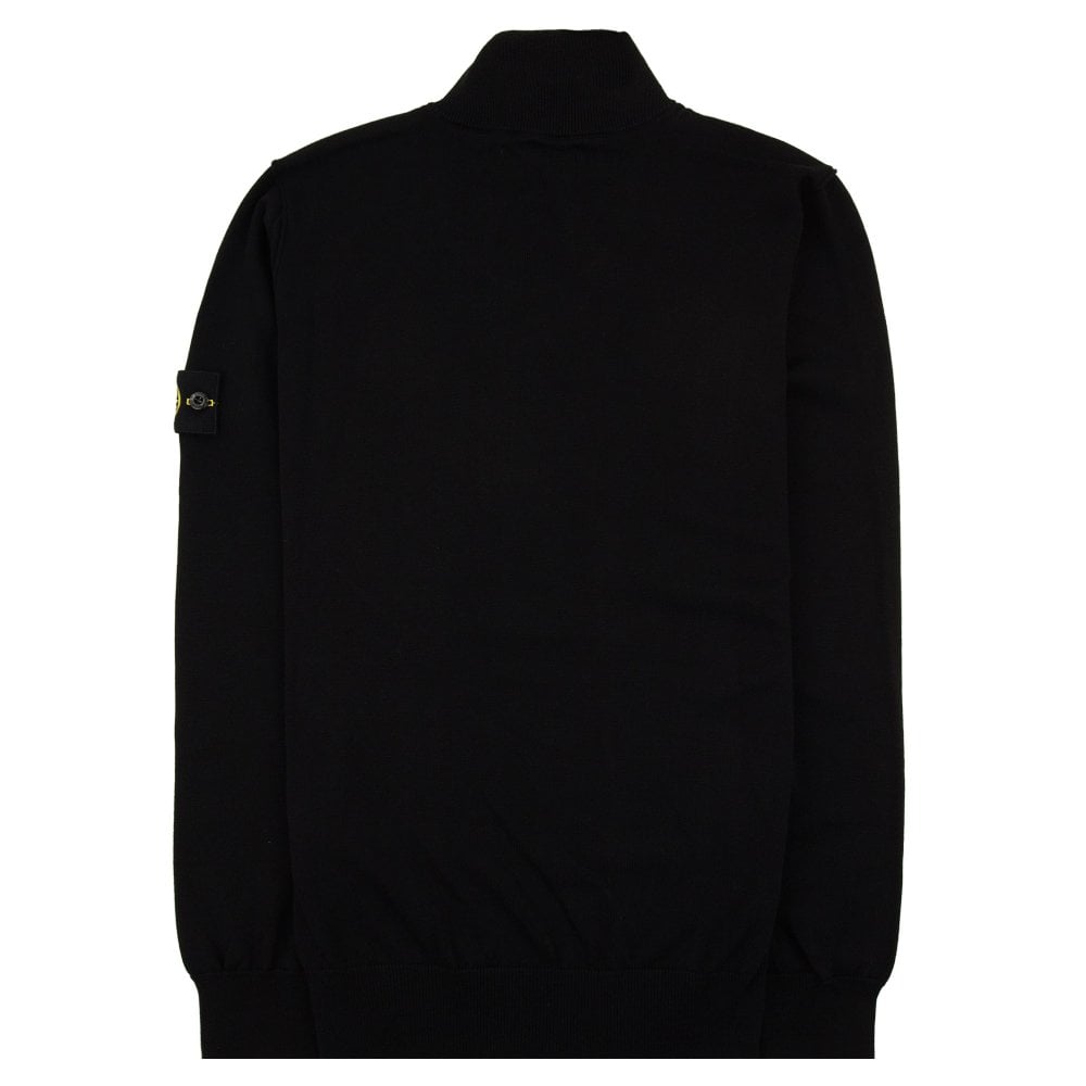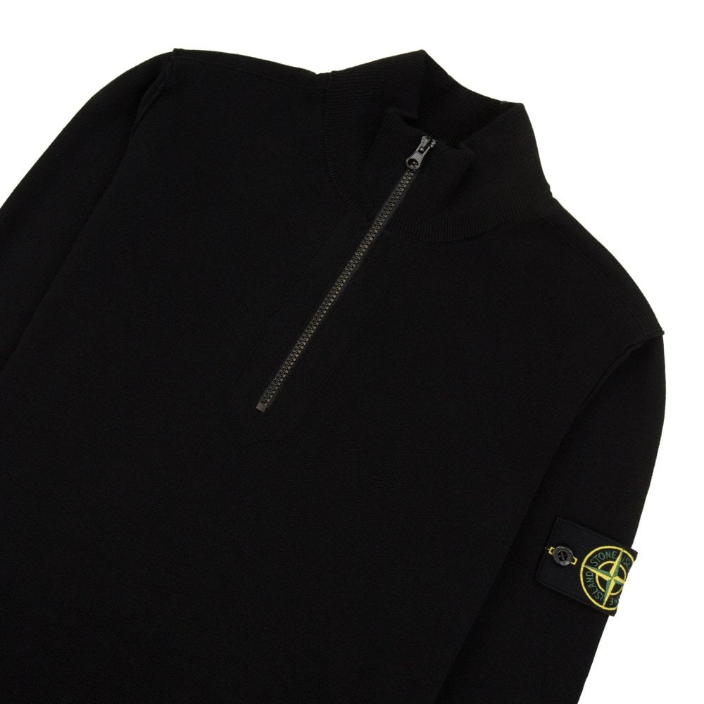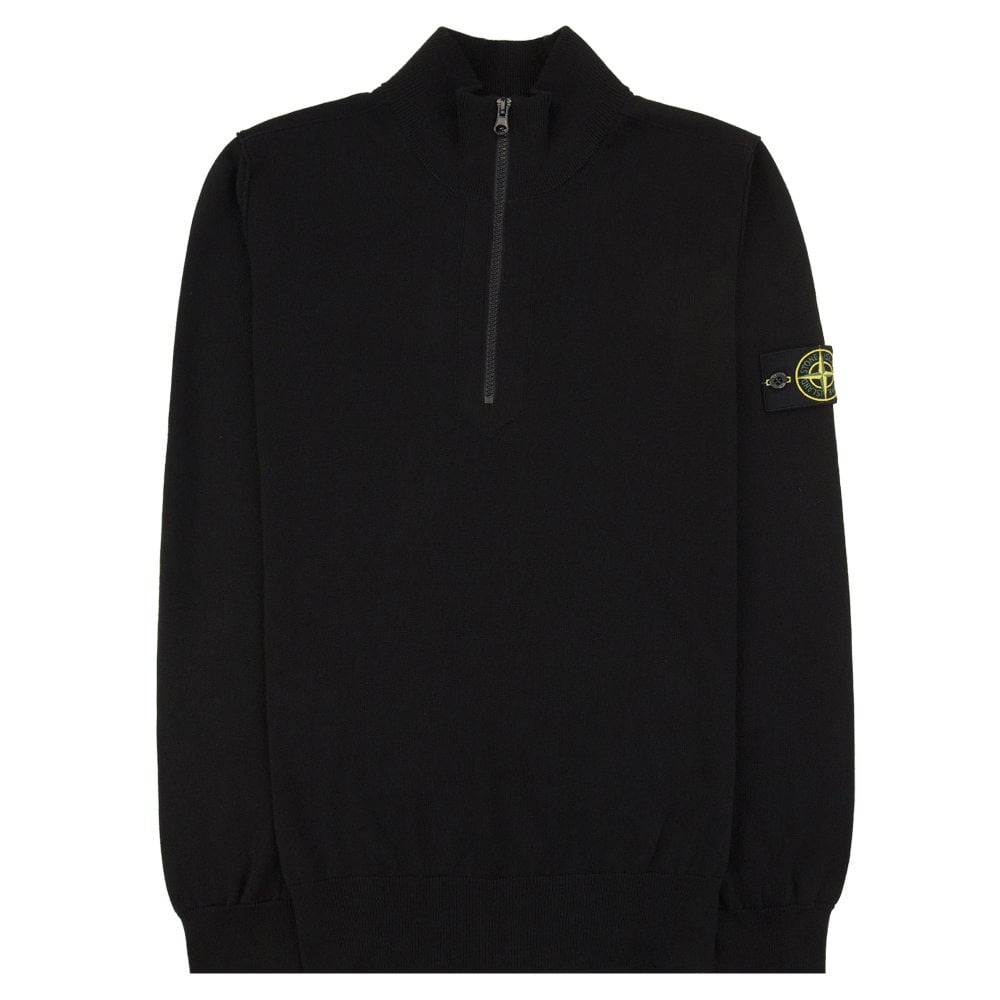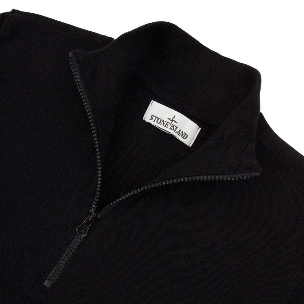 Knit half-zipper sweater made from soft organic cotton with stockinette stitch, featuring standing collar, small roll details, and ribbing. Gauge 14. FABRIC RESEARCH AND TREATMENT Knit half-zipper sweater in soft organic cotton. Stockinette stitch. Gauge 14. STYLE AND FIT Ribbed standing collar with zipper fastening. Small roll at armholes. Stone Island badge on the left sleeve. Ribbed cuffs and bottom band.
