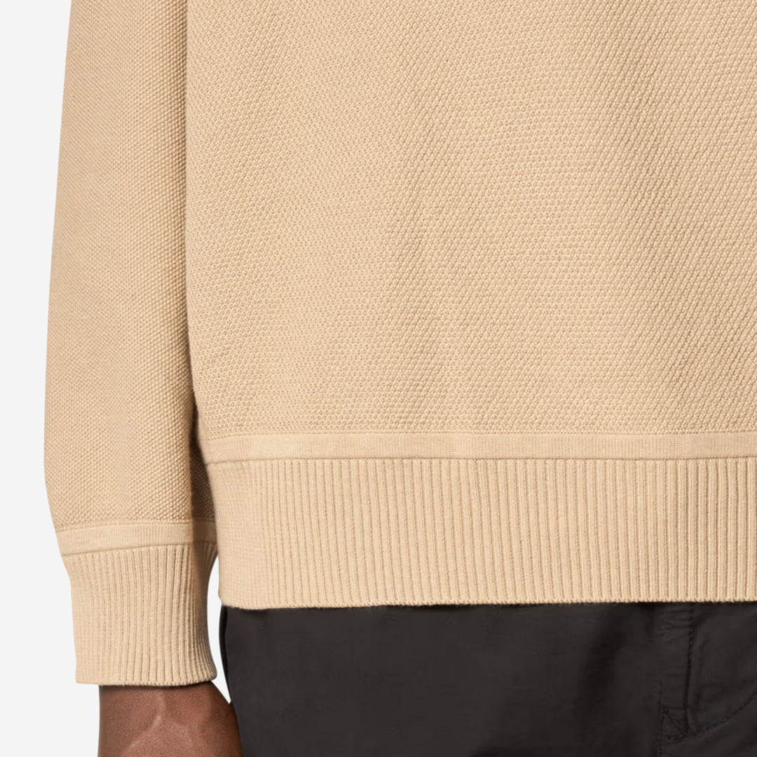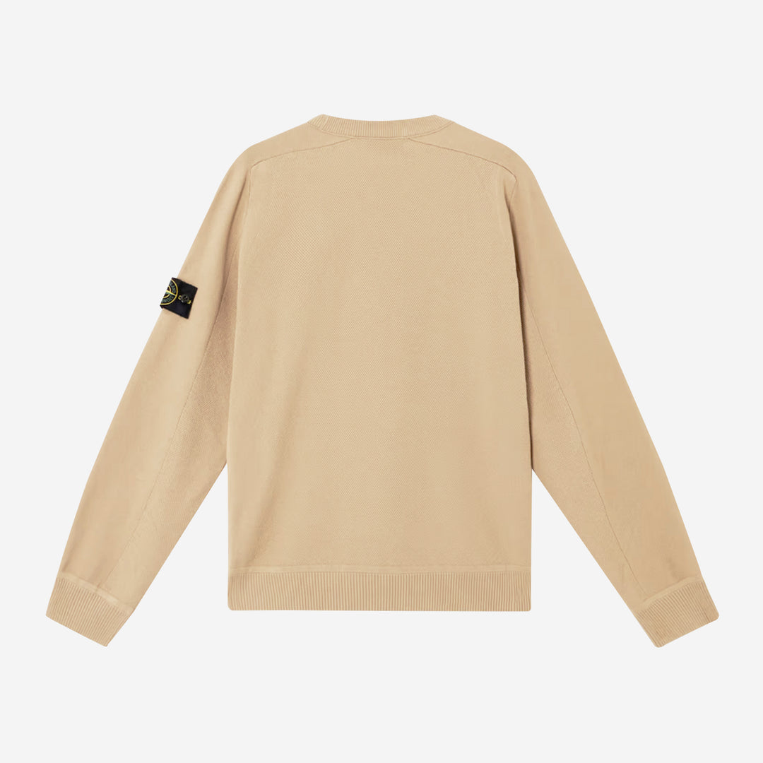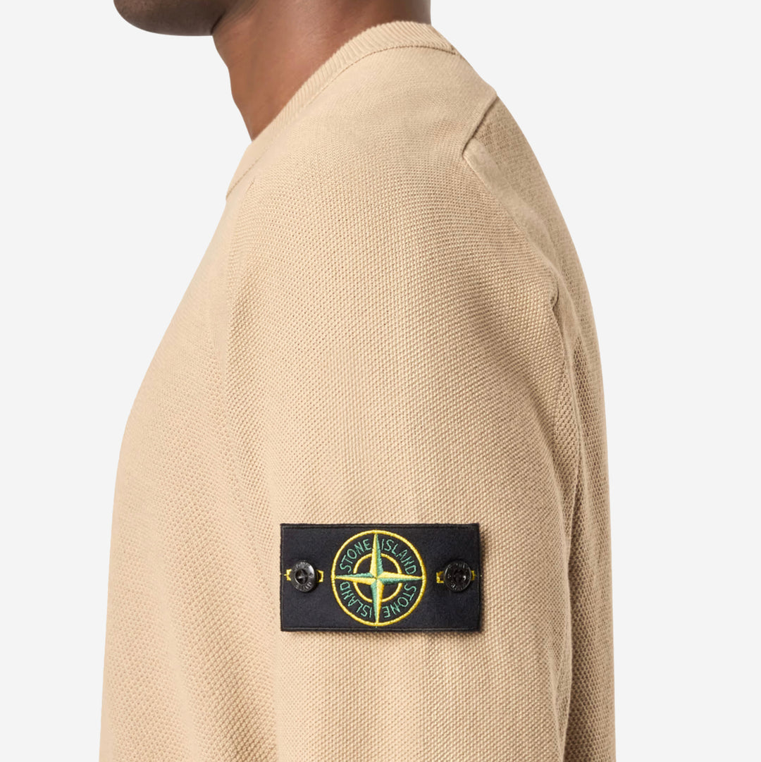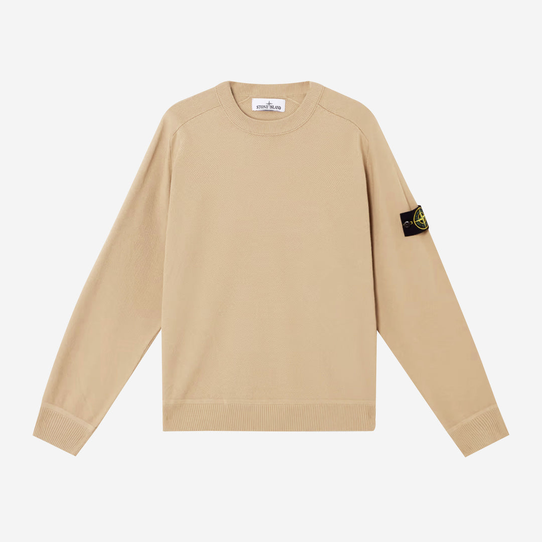 This Stone Island crewneck knit delivers a clean, versatile look with premium craftsmanship at its core. Made from soft, breathable cotton, it offers a lightweight feel perfect for year-round wear. The minimalist sand beige tone gives it a refined edge, while ribbed trims add subtle texture and structure. Finished with the iconic Stone Island compass badge on the sleeve — a signature of quality and innovation.